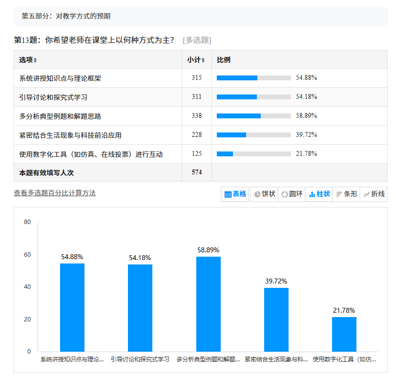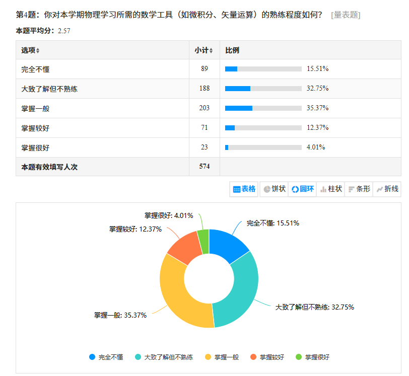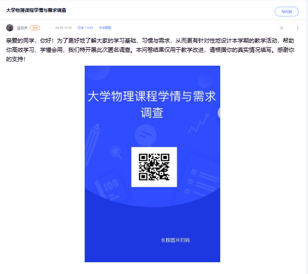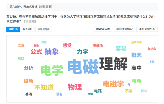 在多次院校培训的基础上,物理教研室着手开展专项调研,设计SC教学改革理念落实问卷,以期把握学生学习需求与难点。通过分析形成调研报告,为学校改革推广提供实践参考,也为本教研室改革的实施提供依据。问卷覆盖所有开设《大学物理A》课程的学生,系统了解学生在学习该课程前的期待与认知。内容涉及学习困难、数学基础、AI工具辅助作用以及物理与专业知识联系等方面。教研室教师对数据进行科学分析,形成调研报告。此次调研旨在定位改革发力点,为后续SC教学改革举措的落地提供数据参考,也为学校整体改革提供了实践范例,将“以学生为中心”的理念融入改革过程。