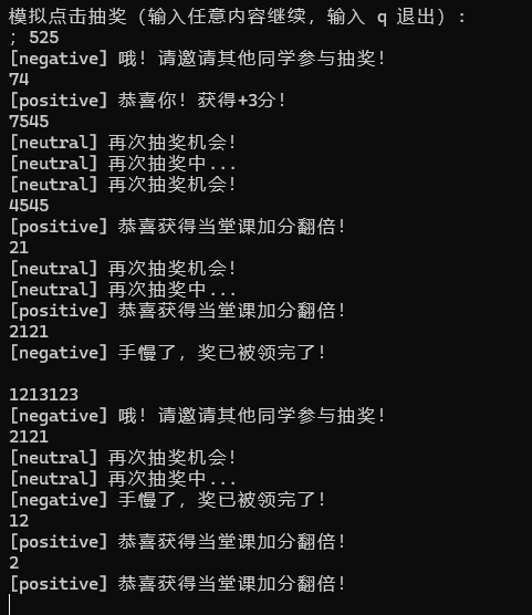 为持续强化学生学习动力,我们建立全过程、多元化激励机制,实现专业课与公共课深度联动,让每一位学生的努力都能得到肯定。课堂发言积极、小组讨论表现优秀、闯关成功、上台讲解精彩、知识图谱绘制精良等均可积累积分,积分可兑换“免一次作业”“优先展示权”或“学习之星”评选资格,充分调动学生的学习积极性;尤为注重发挥学生的专业优势,创新引入学生自主运用专业知识开发的专业课小程序作为奖励载体,学生通过随机数字输入即可解锁不同激励内容,既肯定了学生的课堂表现,又生动展现了学生的专业实践成果,以趣味化激励形式进一步活跃课堂氛围,引导学生形成“学、练、创、评”的良性学习循环,让学习更有动力、更有乐趣。