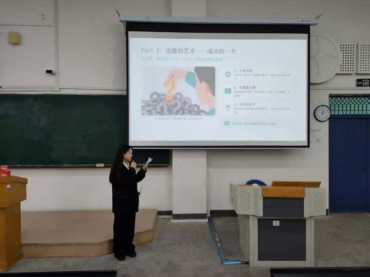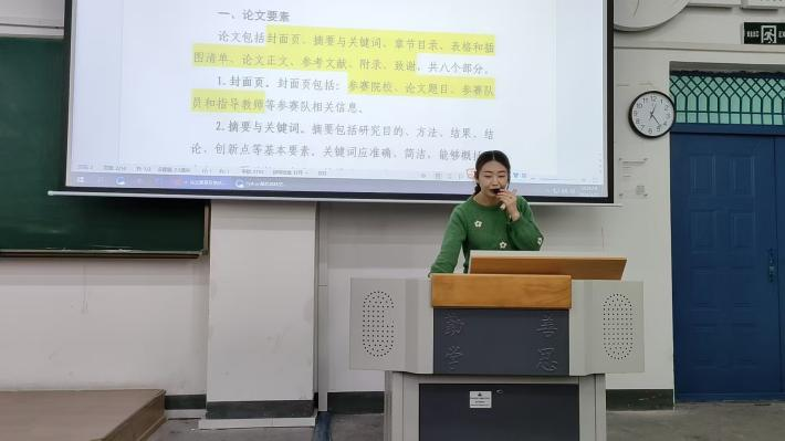 随后,姜珊老师聚焦统计建模竞赛论文写作核心环节,从论文标准格式、结构框架搭建、图表规范使用、文字表述逻辑等方面进行系统讲解。姜老师结合竞赛评审要求,指出了论文写作中常见的格式误区、内容漏洞,并给出针对性的修改建议和写作技巧,让学子们明确了高质量竞赛论文的撰写标准,为后续完成参赛论文提供了专业指导。