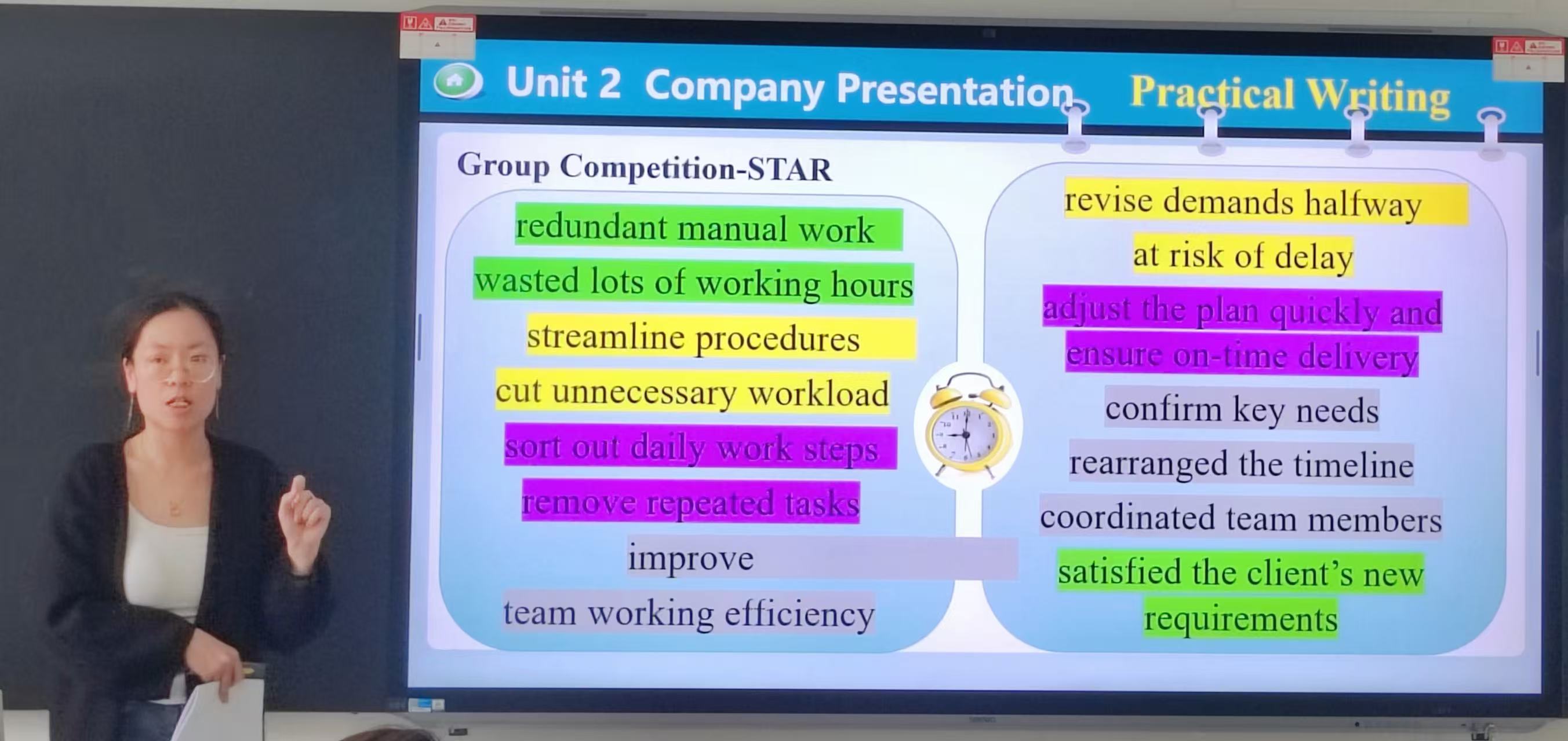 闻洪玉老师以“阅读课合作学习与归纳能力培养”为题进行专题分享。她结合电子信息工程、通信工程等不同专业班级特点,针对学生基础参差、课堂参与度不一的现状,设计了基于课文的小组概括活动与故事复述任务。闻老师组织学生以小组为单位,用一句话概括文章主题、写作方法与关键要点,并使用便签纸书写、白板展示的方式强化过程可见性;随后引导学生基于原文,用简单的主谓宾或主系表结构复述课文情节,鼓励学生脱稿展示。她充分利用白板、磁力纽扣、便签纸等教学资源,在无手机环境下开展合作学习,有效培养了学生的归纳概括与语言组织能力。闻老师同时反思了小组合作耗时较长、部分学生积极性不高等问题,提出进一步优化时间把控与激励机制的探索方向。