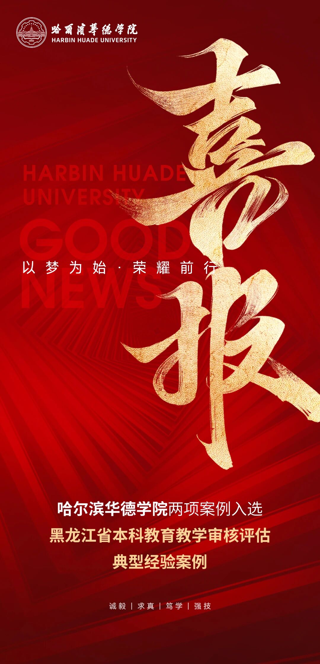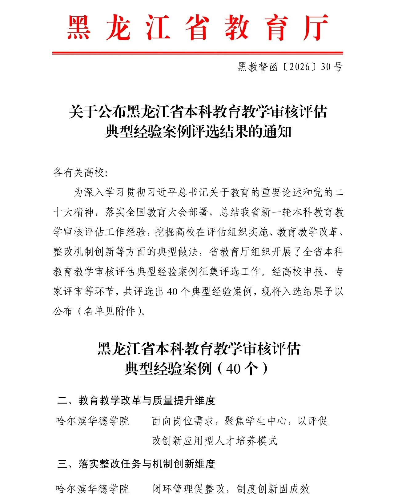近日,黑龙江省教育厅发布《关于公布黑龙江省本科教育教学审核评估典型经验案例评选结果的通知》(黑教督函〔2026〕30号)。在全省遴选出的40个省级典型经验案例中,哈尔滨华德学院申报的《面向岗位需求,聚焦学生中心,以评促改创新应用型人才培养模式》与《闭环管理促整改,制度创新固成效》两项案例光荣入选。