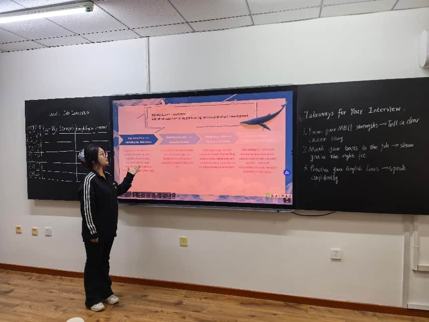 以 SC 理念为核心,许静老师构建“预习感知 — 翻转分享 — 智能精讲 — 文本探究 — 情境应用”教学闭环。她布置翻转课堂任务,邀请有求职实习经历的学生登台分享,从同龄人视角拆解简历打磨、英文问答等实操心得,让抽象知识具象可感。