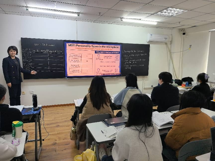 提起职场英语,曾是学生眼中 “背单词、抠语法” 的枯燥课程,而今学生们直呼:“主动组队磨面试稿、抢着参与模拟演练,原来职场英语这么有意思!” 课程开篇,许静老师以趣味 MBTI 职业测试切入,打破学生刻板认知,围绕职业特质与求职适配性展开探讨,自然衔接教学主题,让学生感知到职场英语是求职实用工具,以兴趣点燃探索热情,让课堂从一开始就充满主动性。这门课从 “被动应付”到“主动投入”的蜕变,正是学院以学生为中心、用心设计课堂的成果。